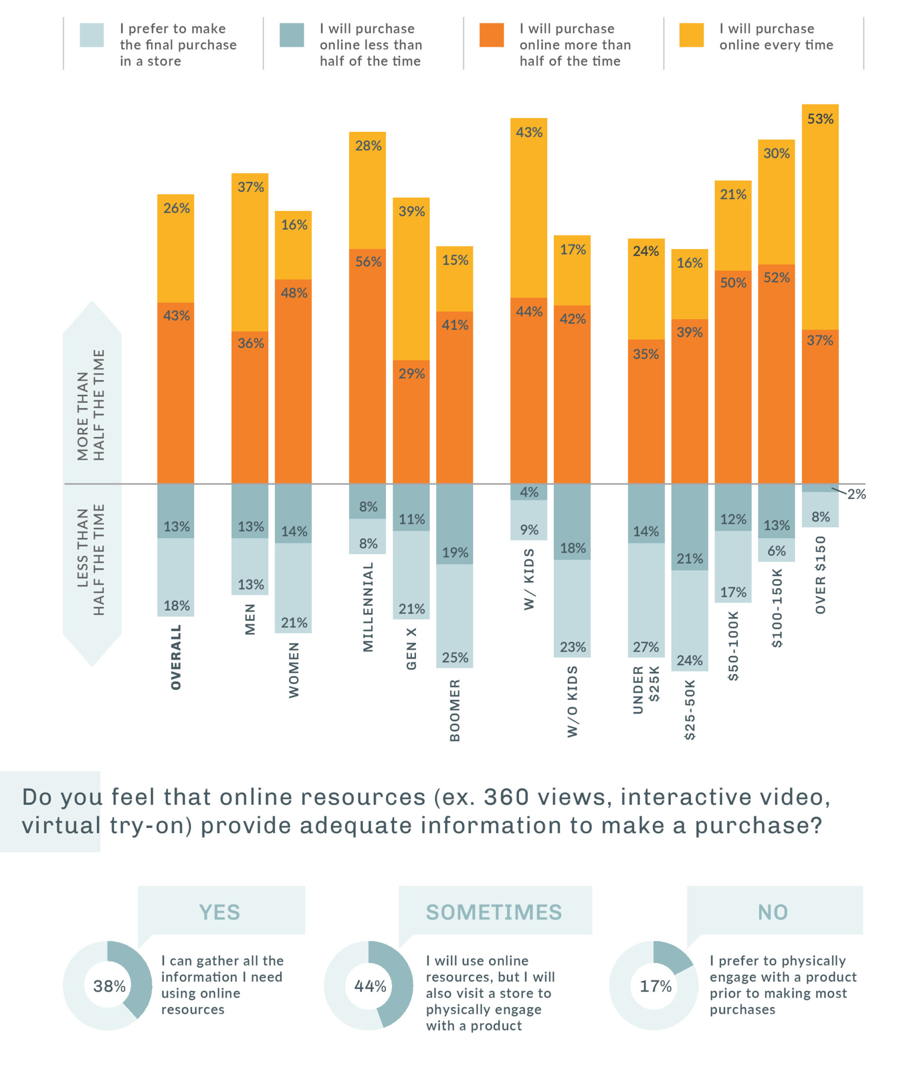 Once it’s time to buy, 18% will make the transition to purchasing in a brick-and-mortar shop while the majority will finish the transaction online at least half of the time.