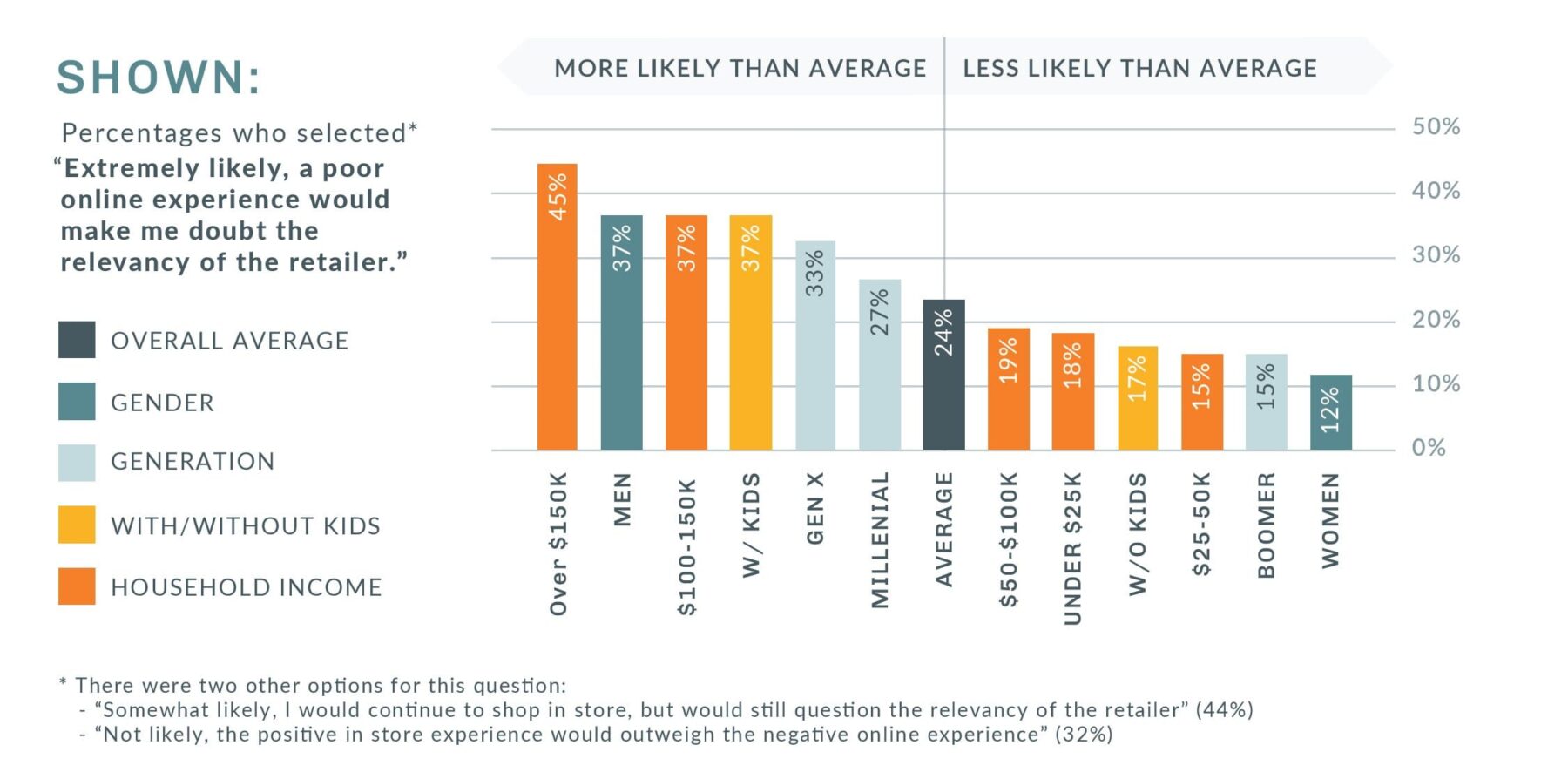 Boomers are the most forgiving, with 45% stating that “the positive in-store experience would outweigh the negative online experience.” Consumers with incomes over $200k are the most likely to have a carryover from a negative experience, with only 13% weighing a positive in-store experience over a negative one online.
