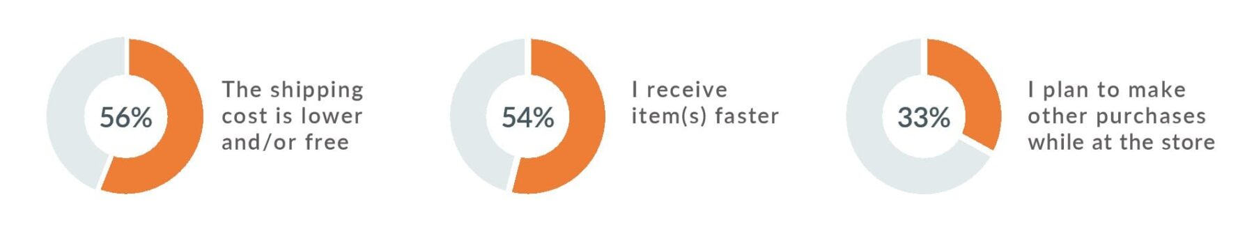 This year, we asked consumers what factors influence their decision to choose in-store pickup. The top two answers–faster and less expensive than shipping–varied depending on demographic and were within a couple of percentage points from each other overall. Planning to make other purchases while at the store came in at a distant third. The responses of those who selected “Other” fell into two main buckets: delivery being unavailable and the ability to physically inspect the merchandise.