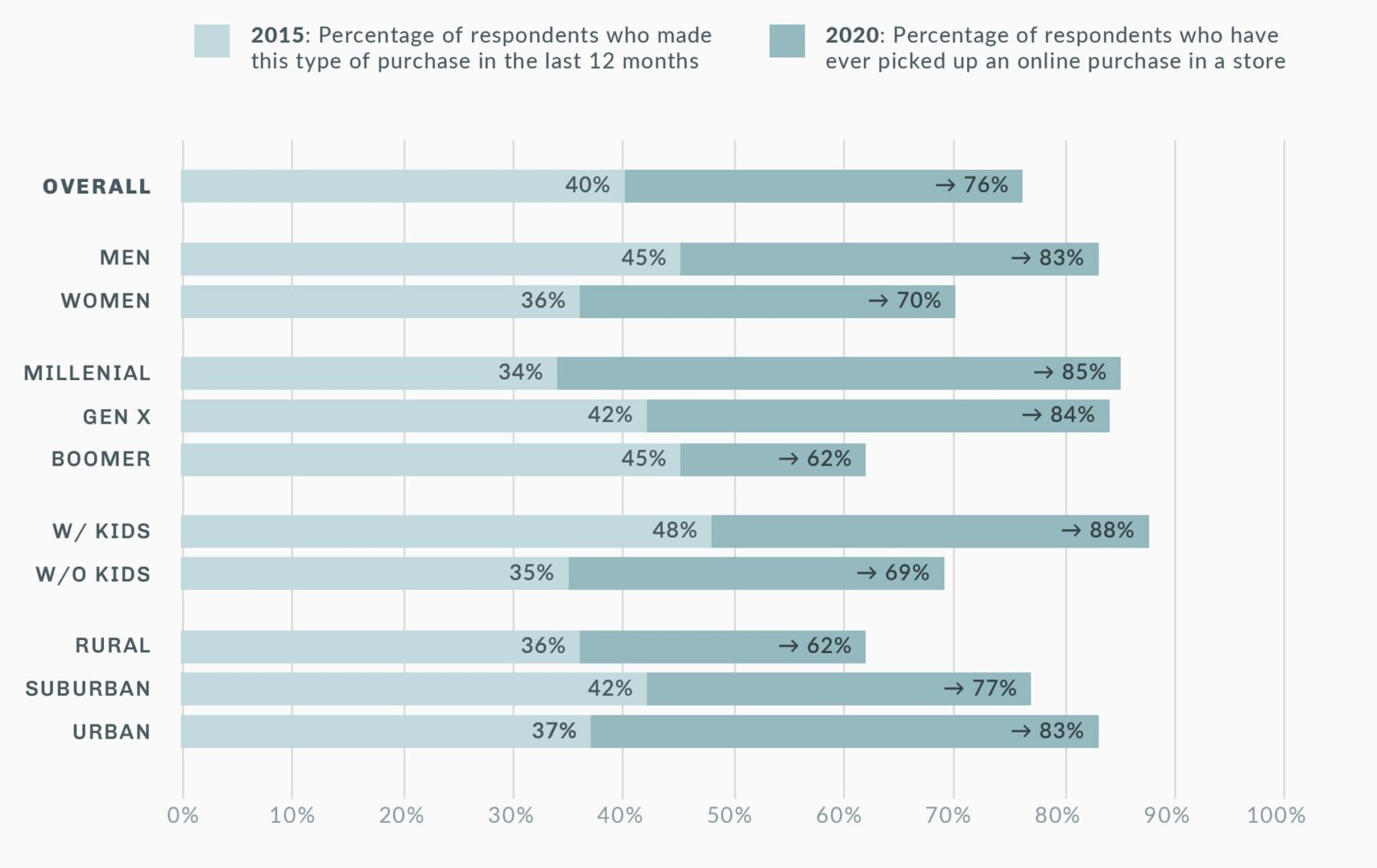 - BOPIS (Buy Online, Pick Up In Store) surged from 40% in 2015 to 76% in 2020, with demographics varying by age and income.