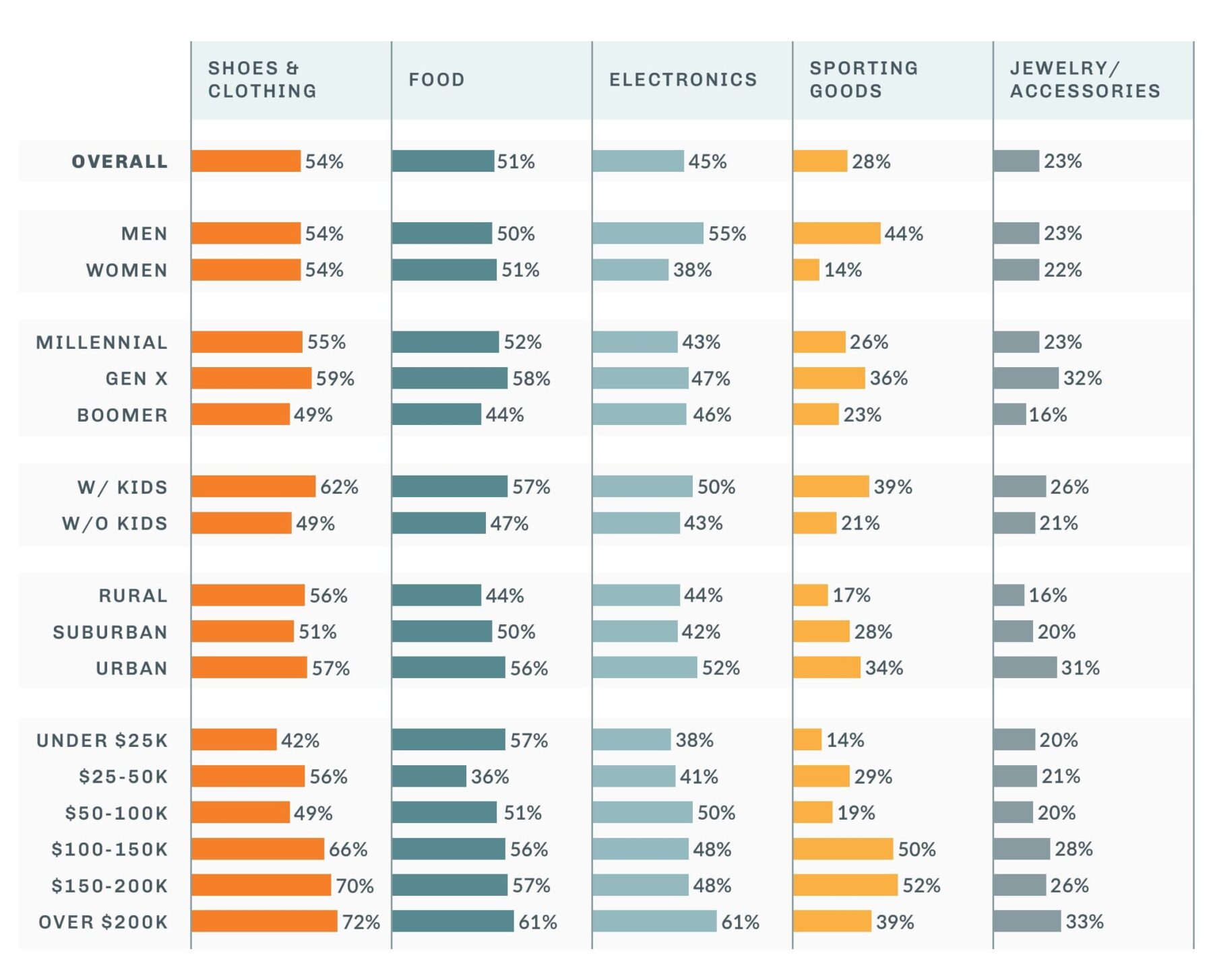 This year, 62% of consumers have made such a purchase at least once over the past 12 months. In fact, at least 50% from each demographic reported doing so, with the lowest being Boomers at 51%. The largest majority was consumers with incomes over $200k, at 83%.