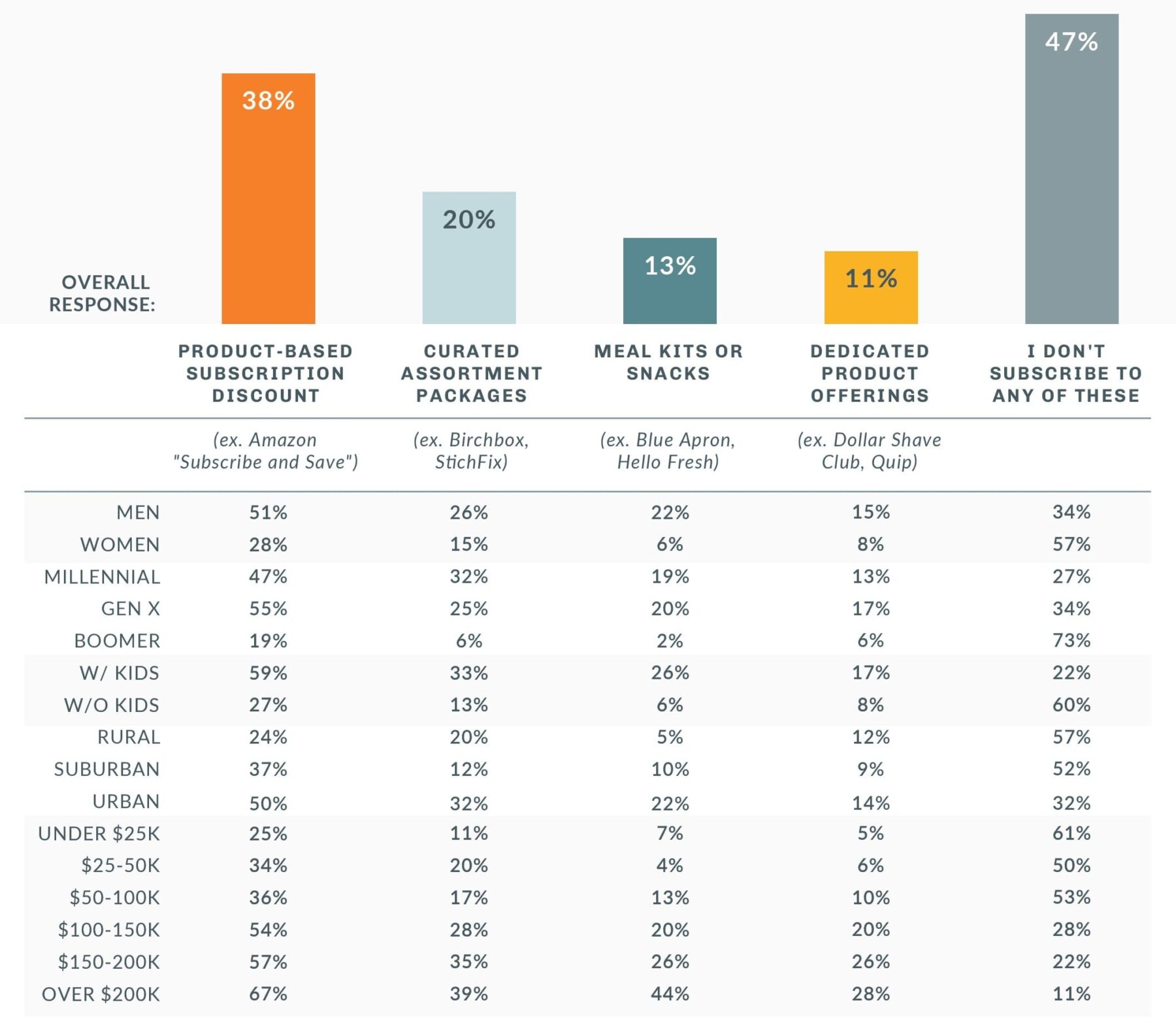 Millennials who subscribe to a service increased by 50 percentage points (from 23% up to 73%), compared to Boomers, who had the least amount of growth of any demographic, with a scant seven percentage point increase (from 20% to 27%). That also makes Boomers the least likely to subscribe to a service overall. Consumers with an income of over $200k annually are the most likely to have a subscription, with a whopping 89%.