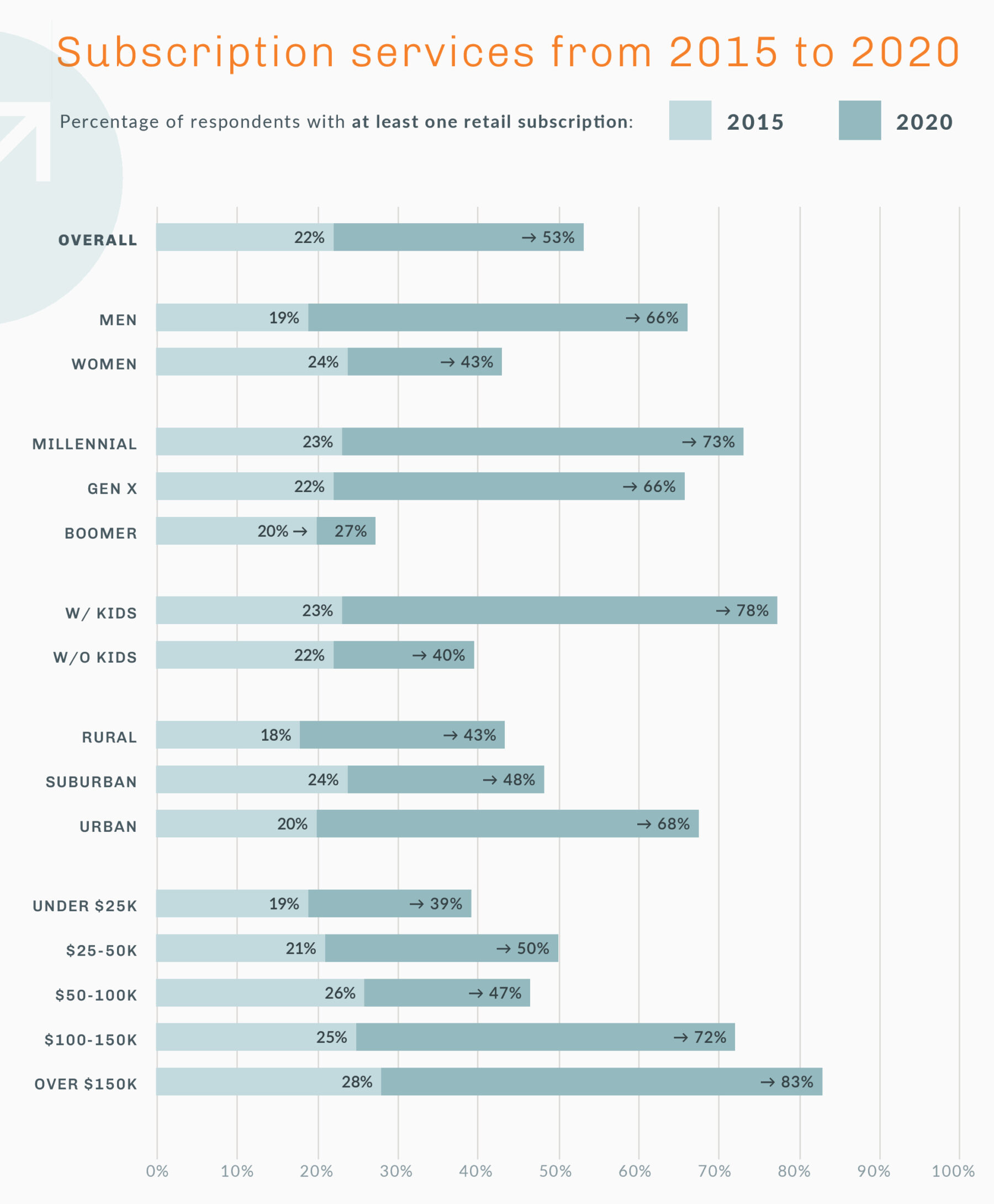 In 2015, we reported that 1 out of 5 consumers was signed up for an ongoing “subscription” retail purchasing agreement. This year that ratio has shifted significantly: