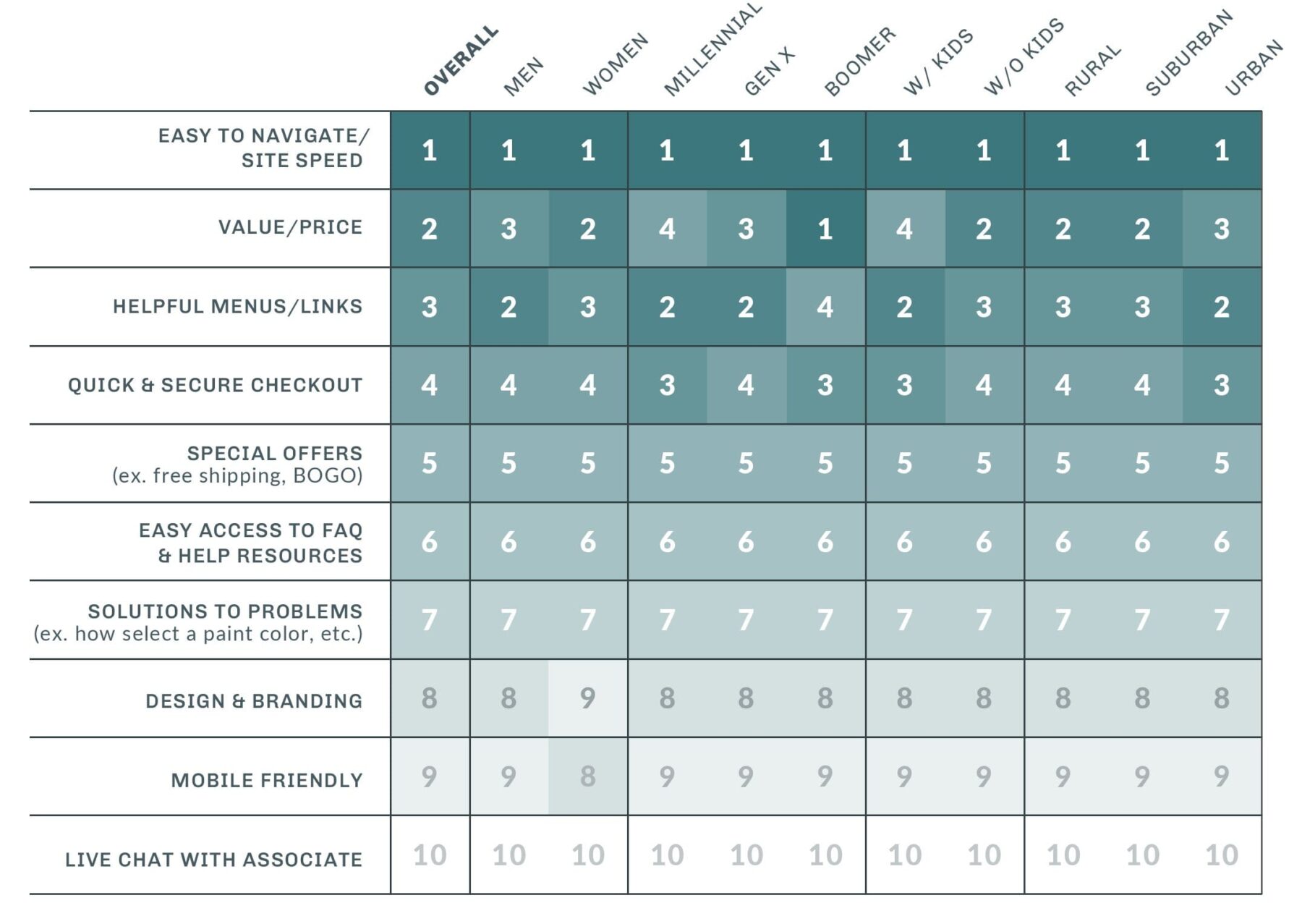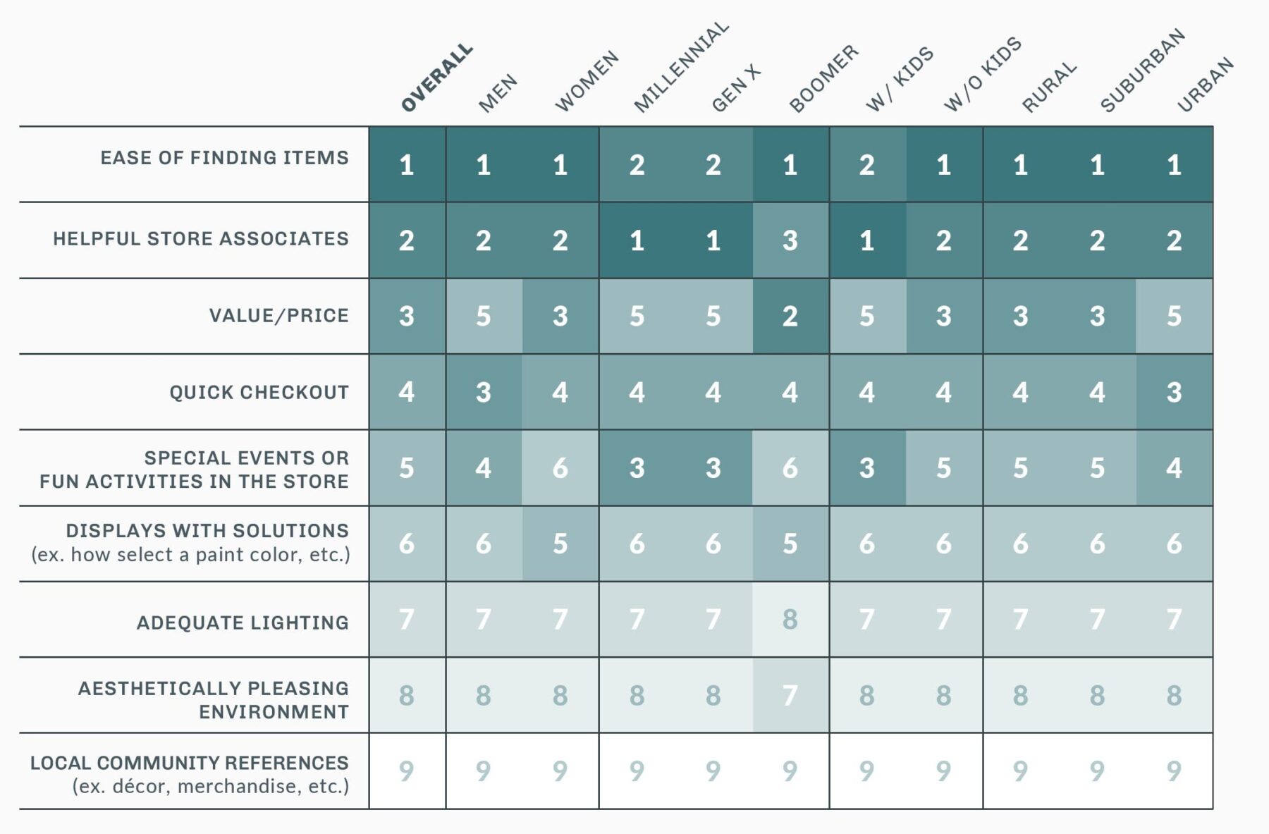 While Boomers (and consumers who make between $150k and $200k) keep ease of finding items at number one, they select value/price as the second most important item, nudging helpful store associates down a notch.