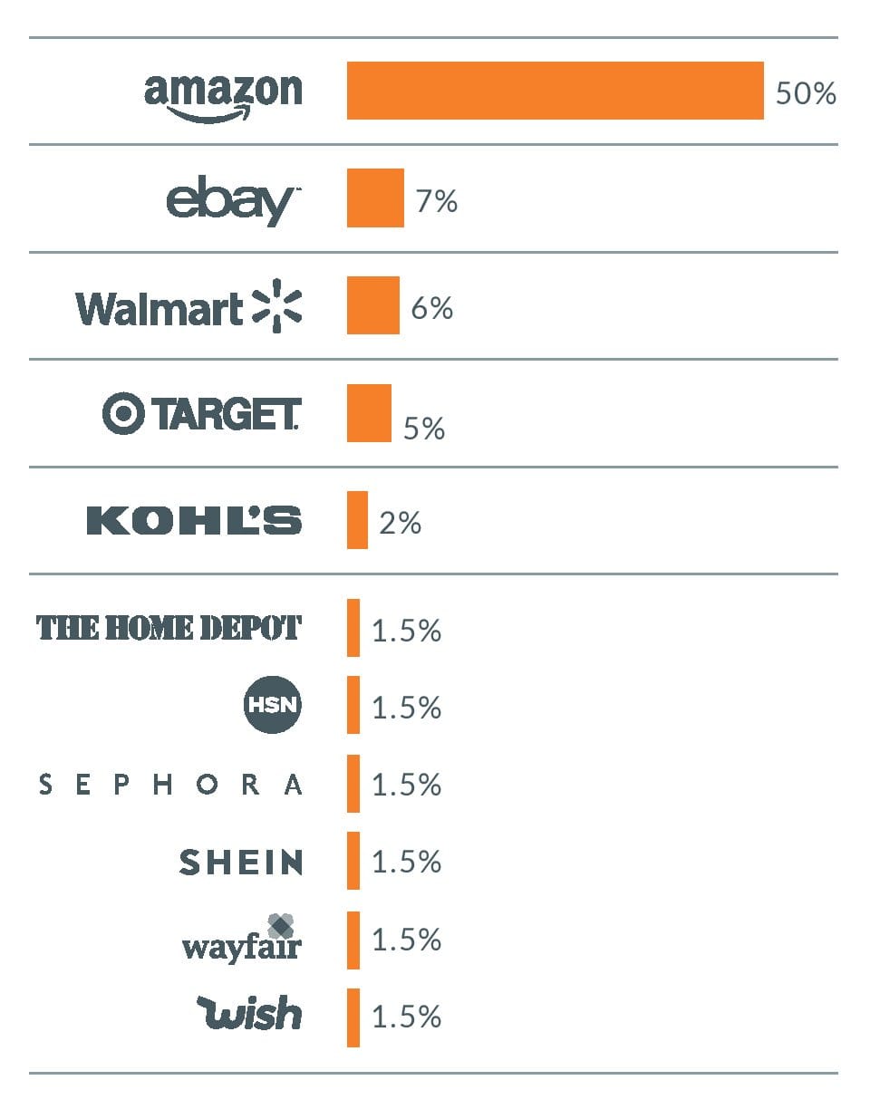 Walmart has a clear majority at 22% while all three of the number 10 spots only have a little over 1% of the tally each.