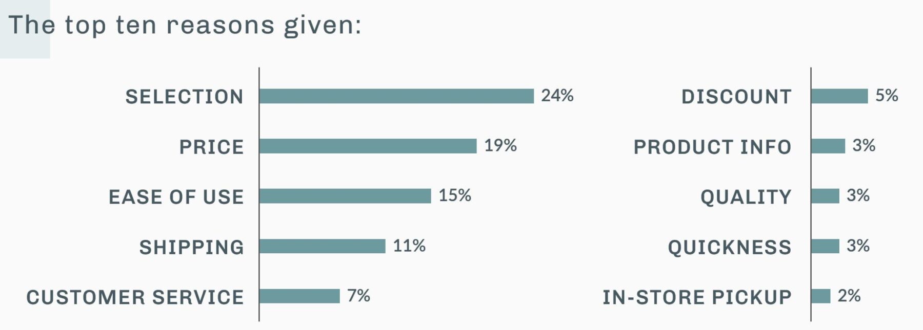 By comparing the reasons given between online shopping and in-store shopping, it’s clear that customer service is the distinguishing factor for in-person experiences while selection provides the pull for online shopping.