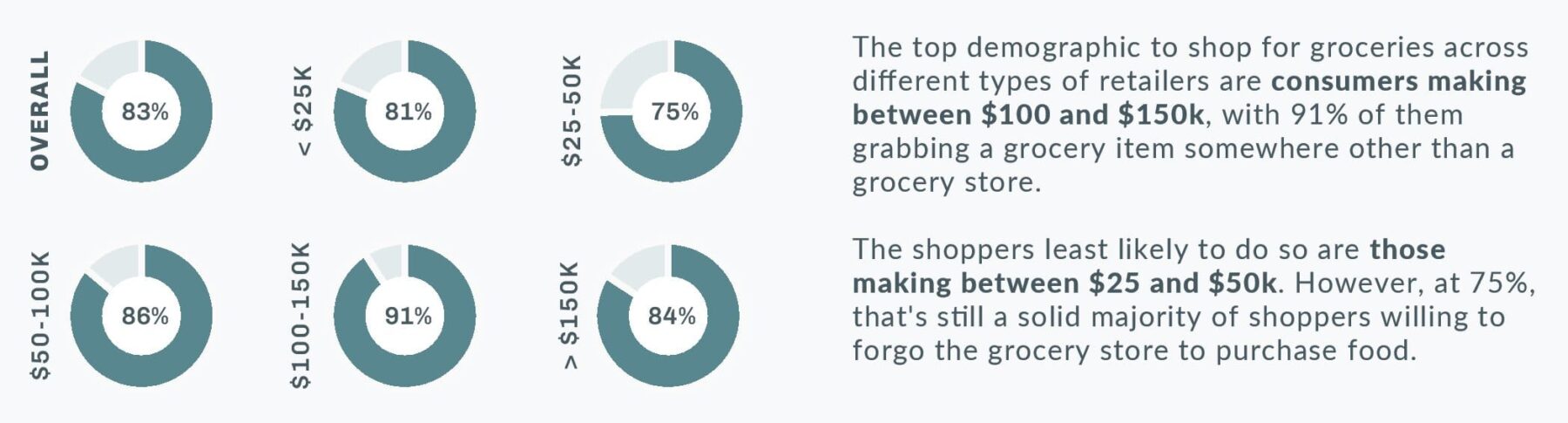 At the same time, more buyers (42% compared to 28%) have planned to purchase their entire grocery list at a non-grocery retailer, showing a strong upward trend of intentionally shopping elsewhere rather than