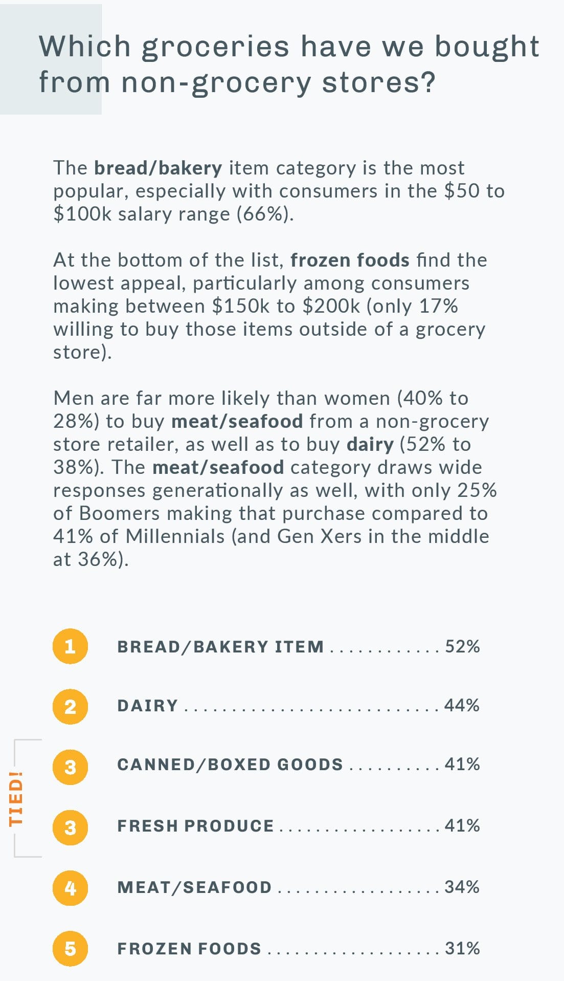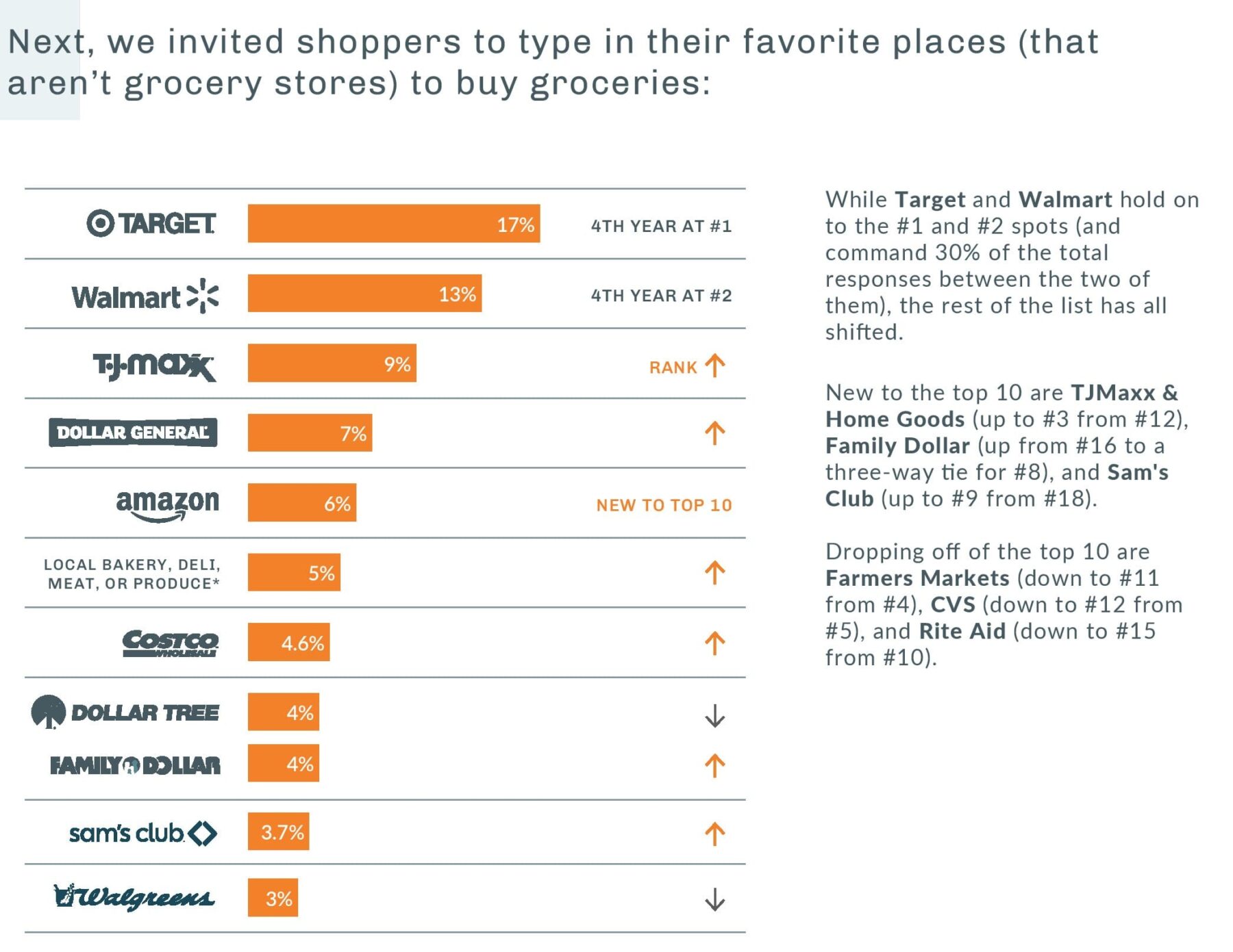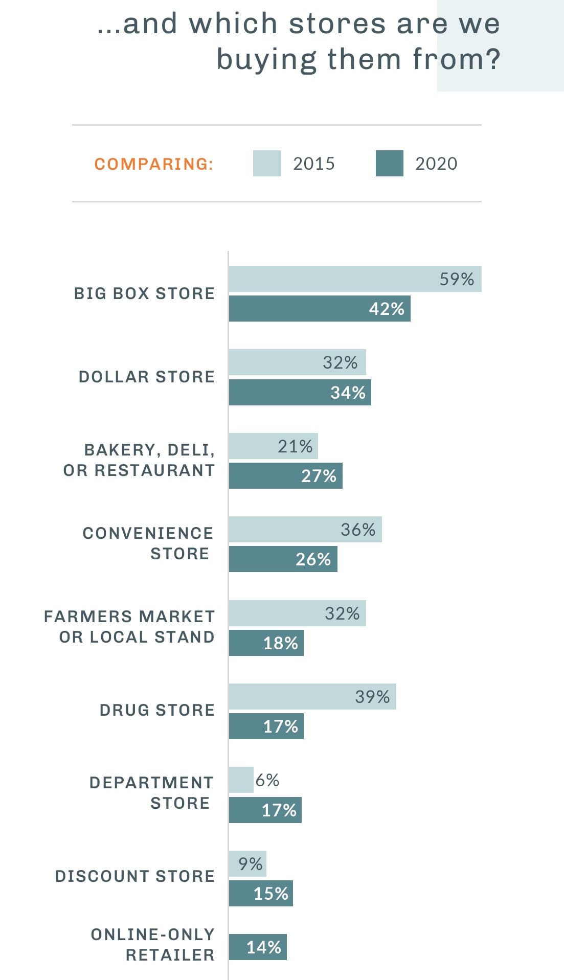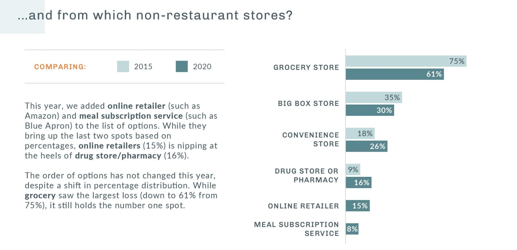 New to 2020, we added online-only retailers (such as Amazon) as one of the non-grocery store options. It debuts in last place (14%) but only slightly behind discount stores (15%).