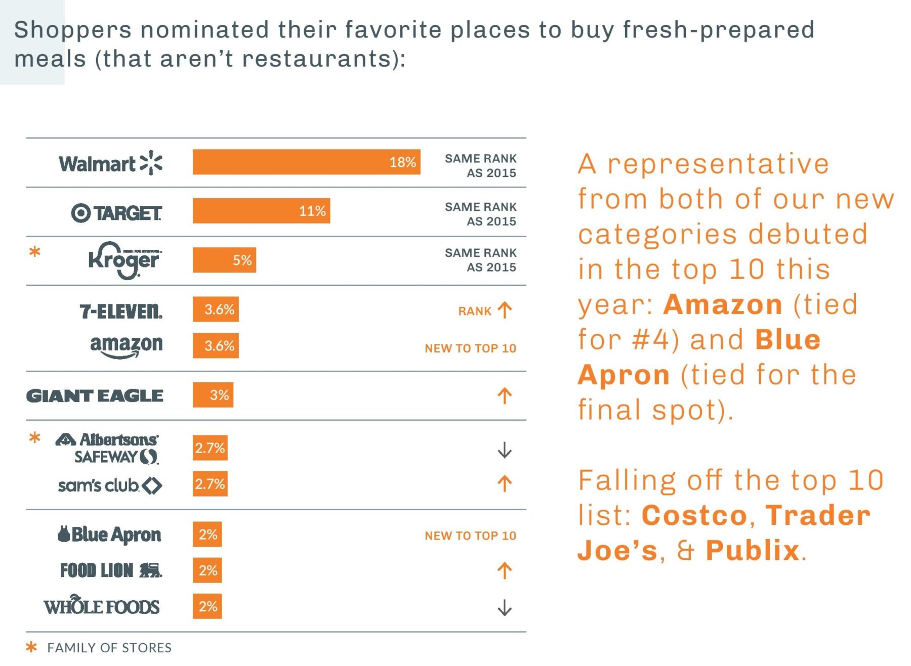 Old Navy dropped out of the top 10 list from 2015 (as did Sam’s Club, Kmart, Publix, and TJ Maxx/Home Goods from 2016). Joining Amazon as new entries are Lowe’s, Kroger, Victoria’s Secret, and Marshalls. The differences between companies are razor-thin this year, with a two-way tie for both 8th and 9th place and a three-way tie for the final spot, resulting in a top 10 list that has 14 companies listed.