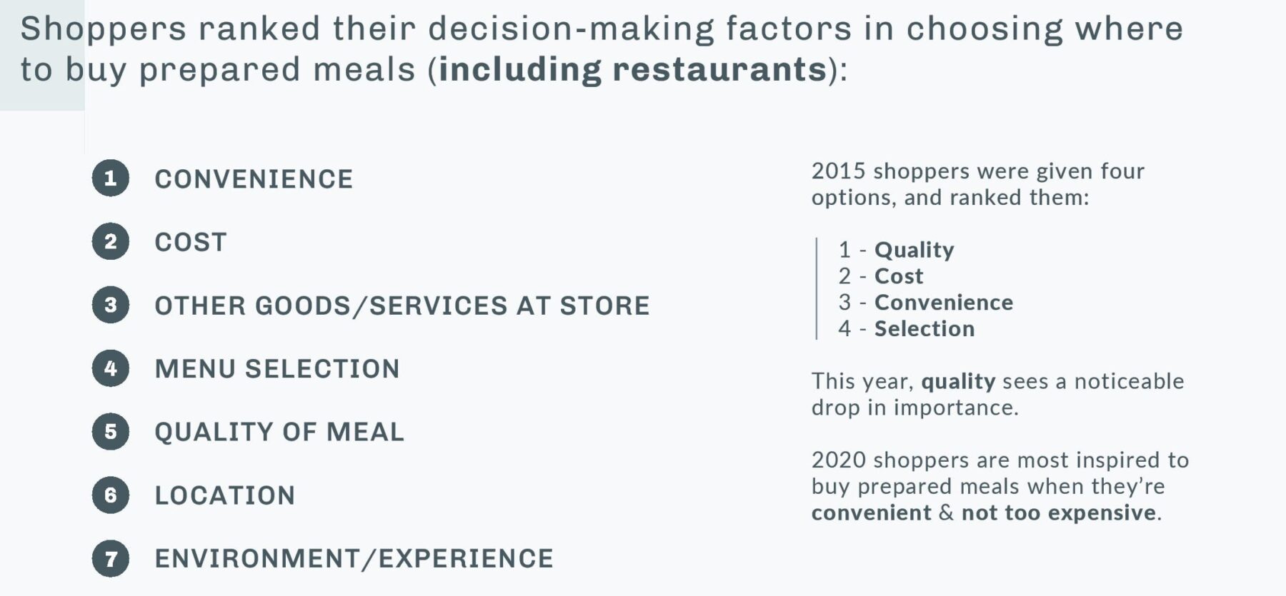 Zooming out, 2020 shoppers ranked influence factors similarly across all three category-blurring topics: Grocery, Prepared Meals, and Apparel. Notably, cost & convenience sat at the top of all three lists.