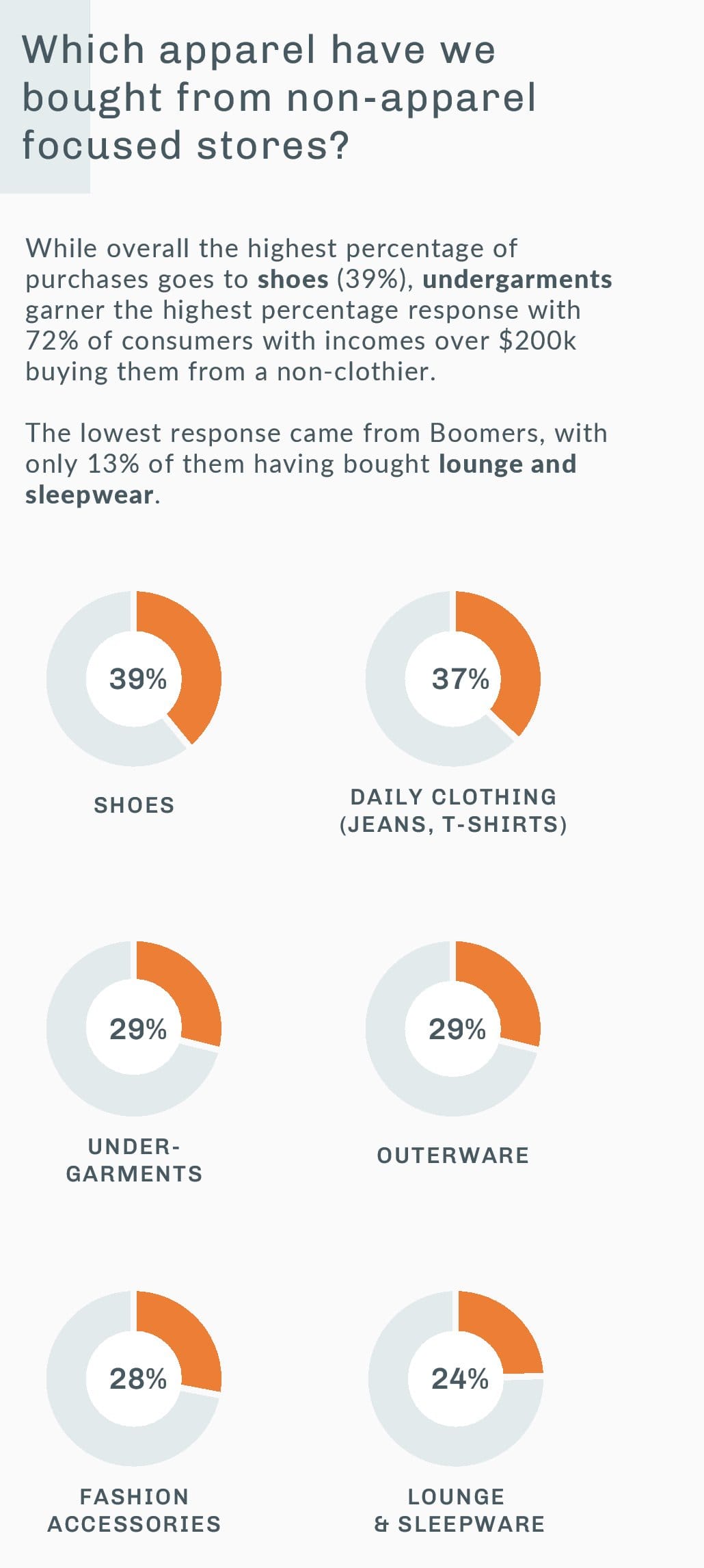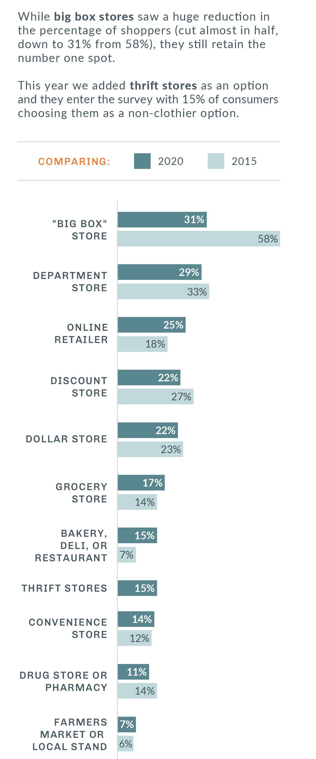 We first added questions about apparel in our 2016 survey, so 2020’s comparisons go back four years instead of five. In 2016, slightly under half of consumers (49%) had made an apparel purchase from a store other than an apparel-specific retailer.
